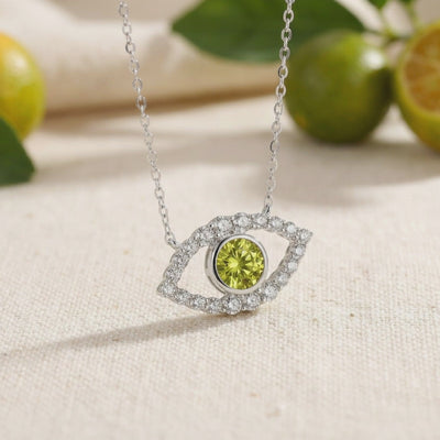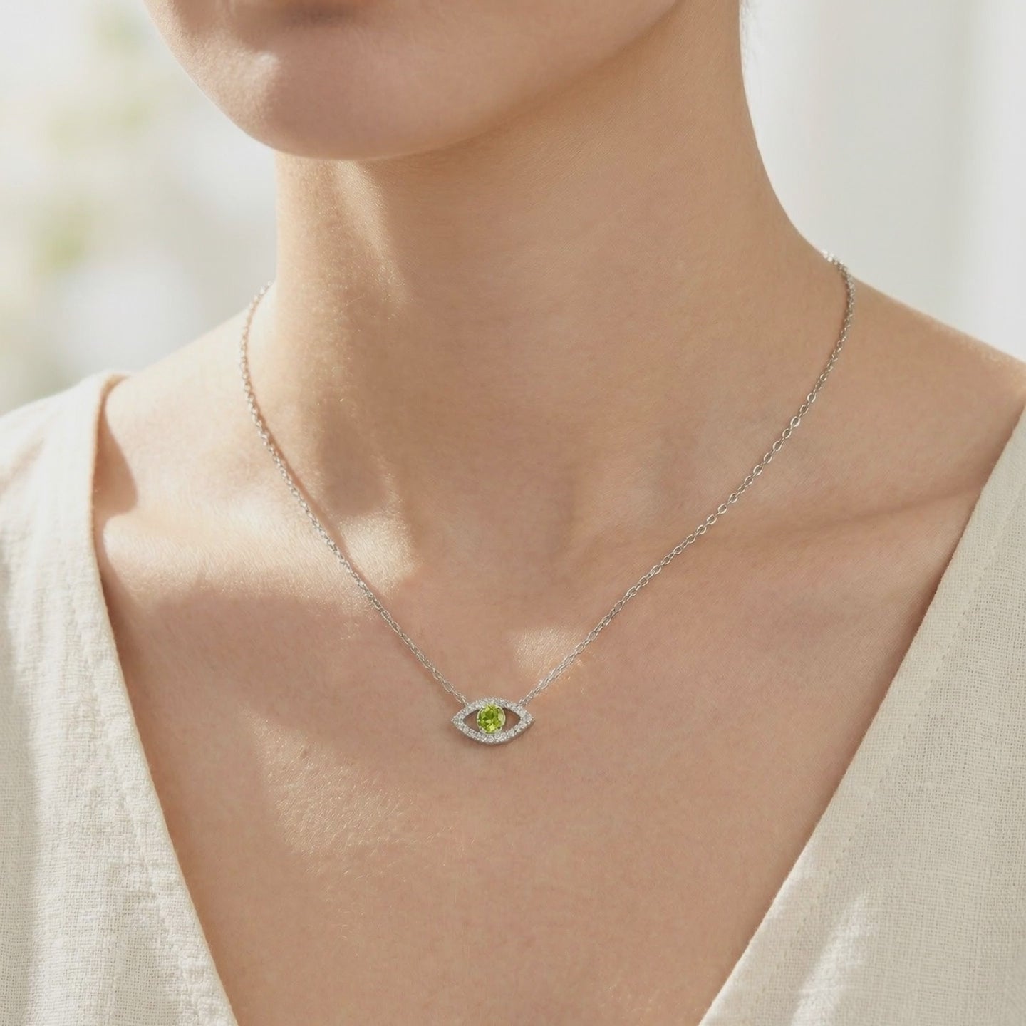 Close-up of a silver eye pendant featuring a round cut yellow-green moissanite and clear accent stones.