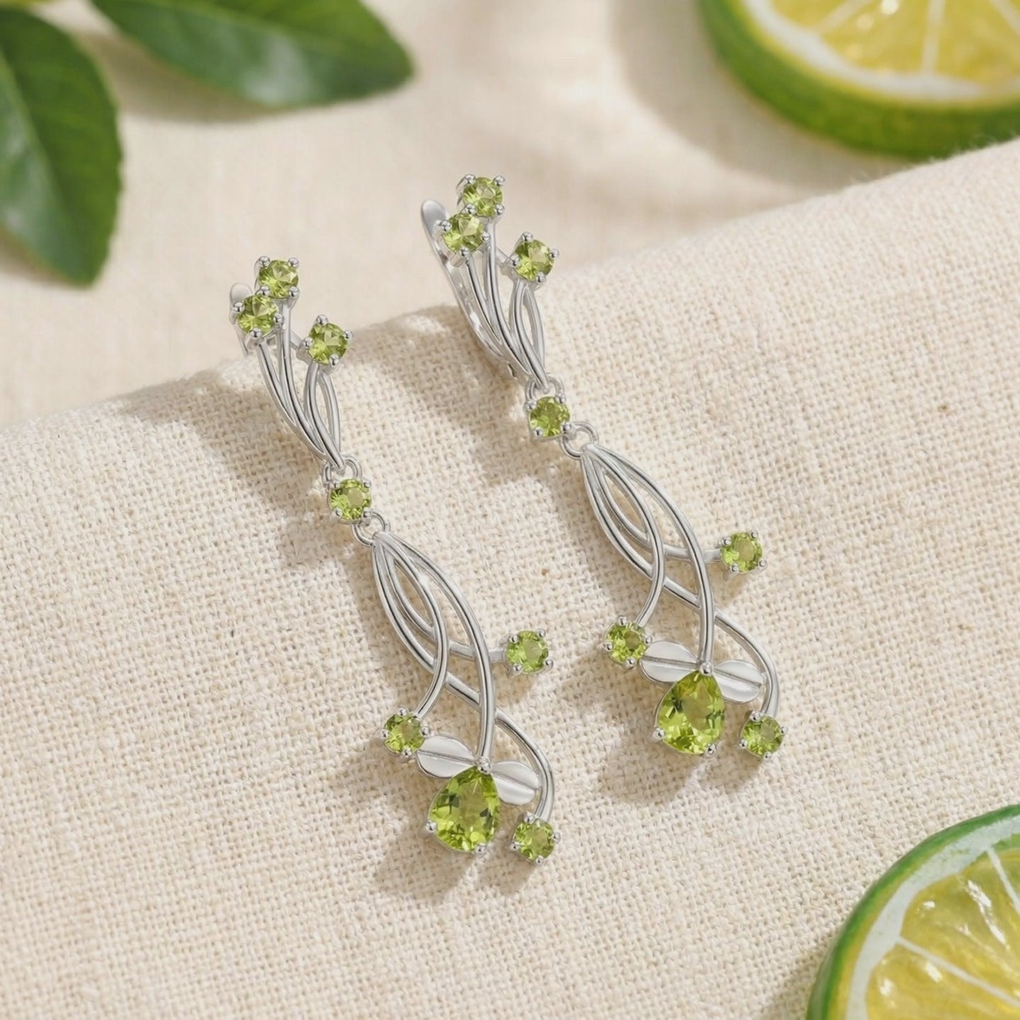 Macro view of sterling silver vine earrings showing pear-cut and round-cut green simulated peridot stones.