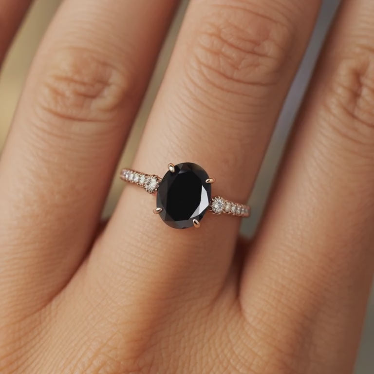 This ring isn't just jewelry; it's a moment she'll cherish forever. Make a powerful statement with The Luna. The centerpiece is a striking 2CT Oval Cut Black moissanite, a gem of bold sophistication. SurOvaling it, a band adorned with shimmering stones creates a captivating contrast, a subtle galaxy of light on her finger.
