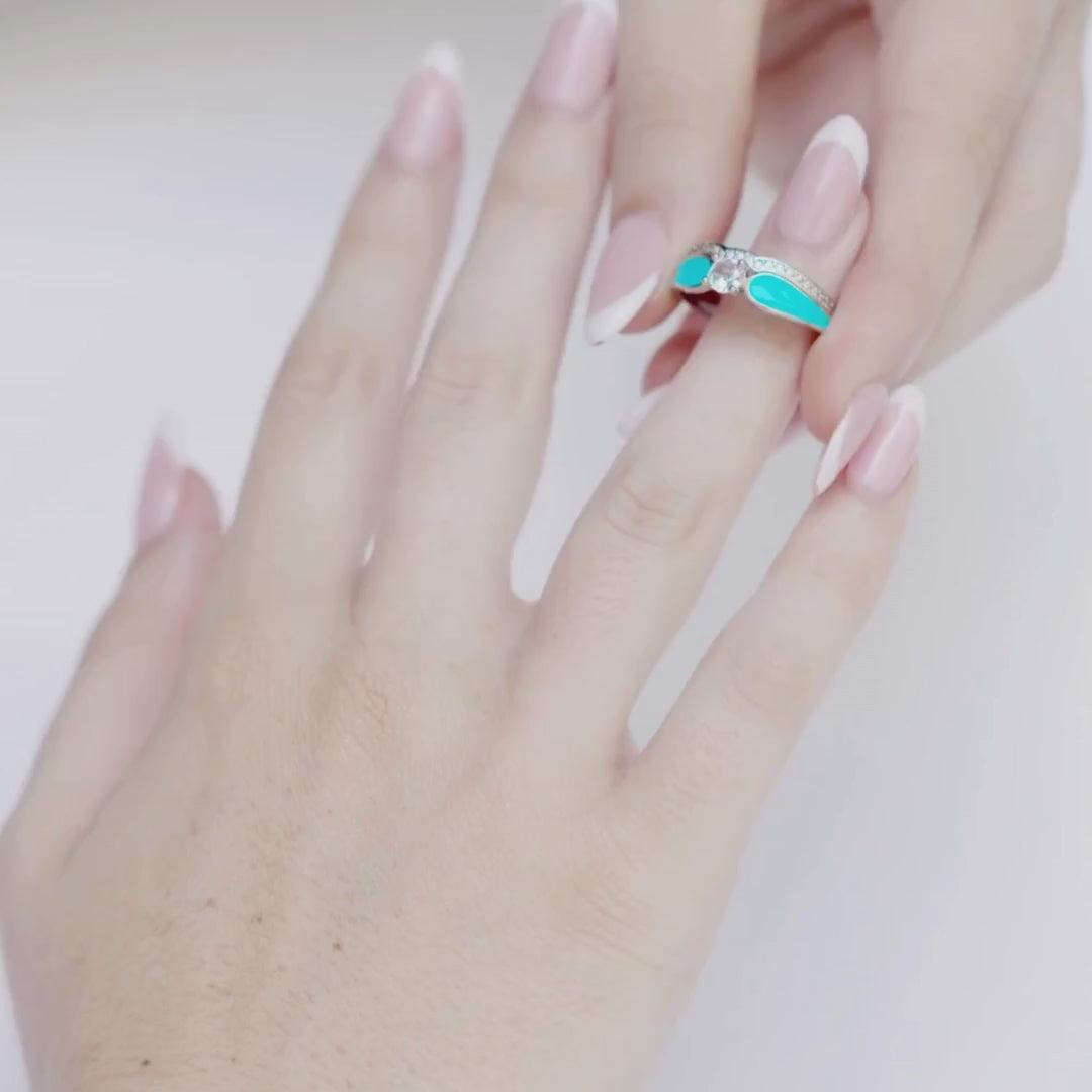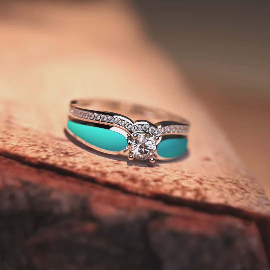Experience the grace of S925 sterling silver in this 2 piece set ring. The bright blue color of the lagoons is captured in the turquoise hue. The ethical diamonds shine like droplets in the sun. But it's the duality that sets it apart. Wear the rings stacked for an exquisite statement or let them shine individually on adjacent fingers. The choice is a testament to your style and flair.