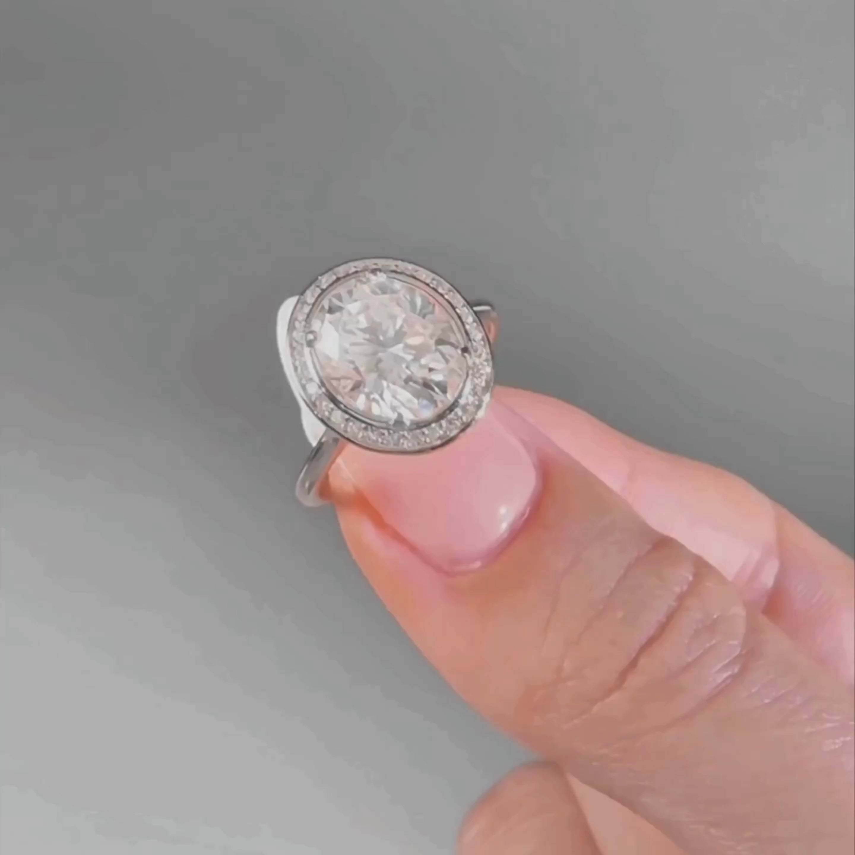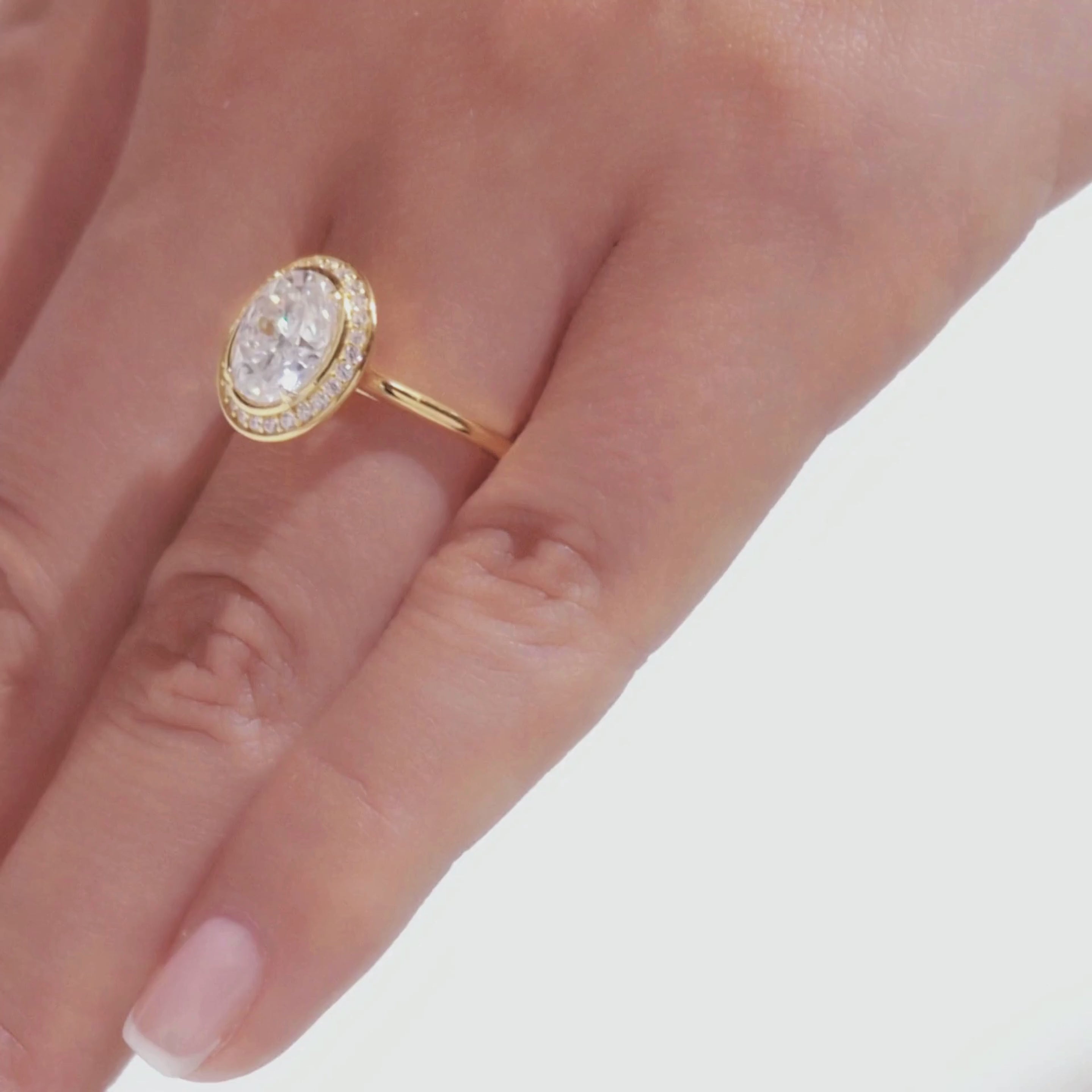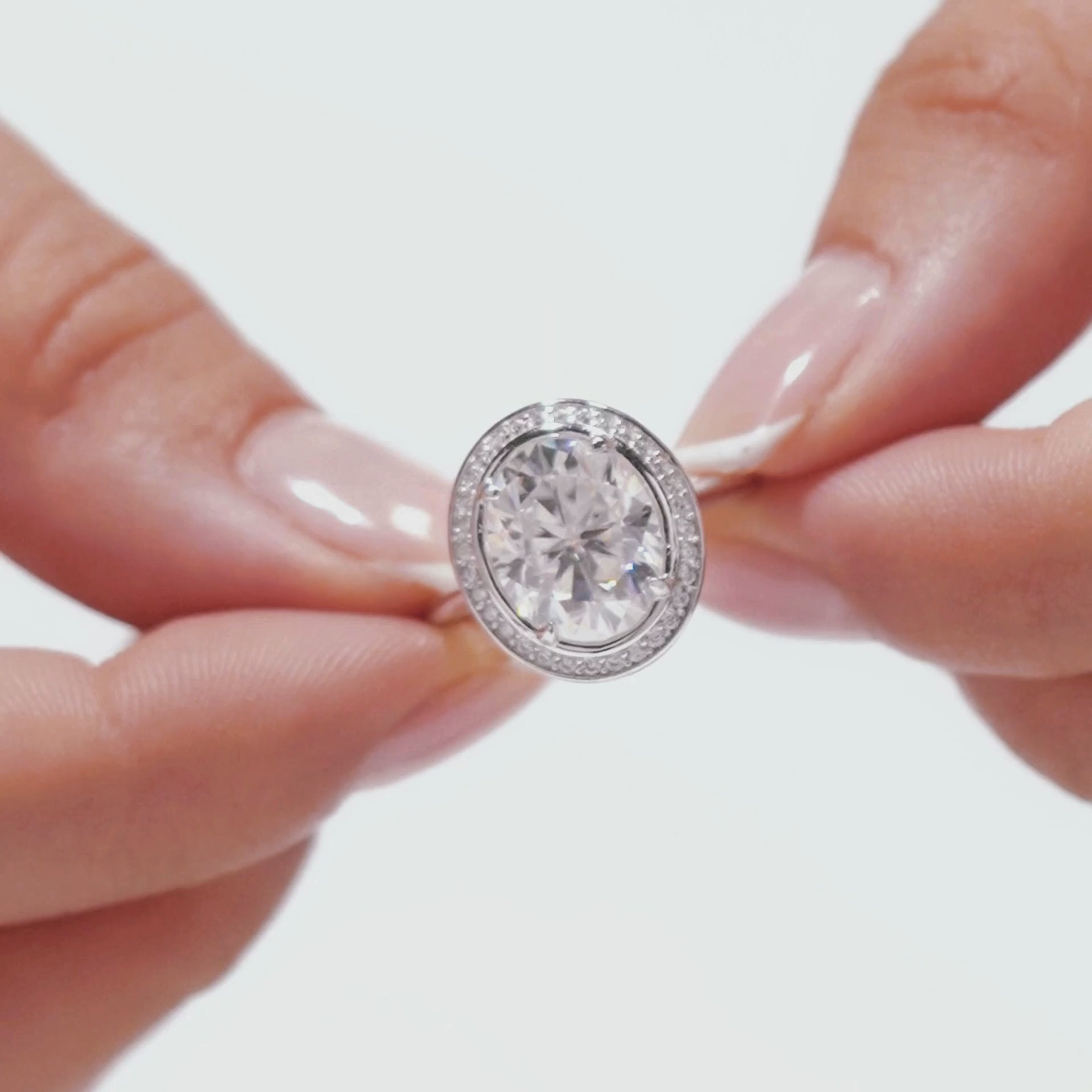 The Elizabeth showcases an exquisite oval-cut moissanite stone in a secure prong halo setting on a band of 18K Gold Vermeil over S925 Sterling Silver. Its timeless appeal and flawless clarity make it a statement piece for engagements, anniversaries, or celebrations.