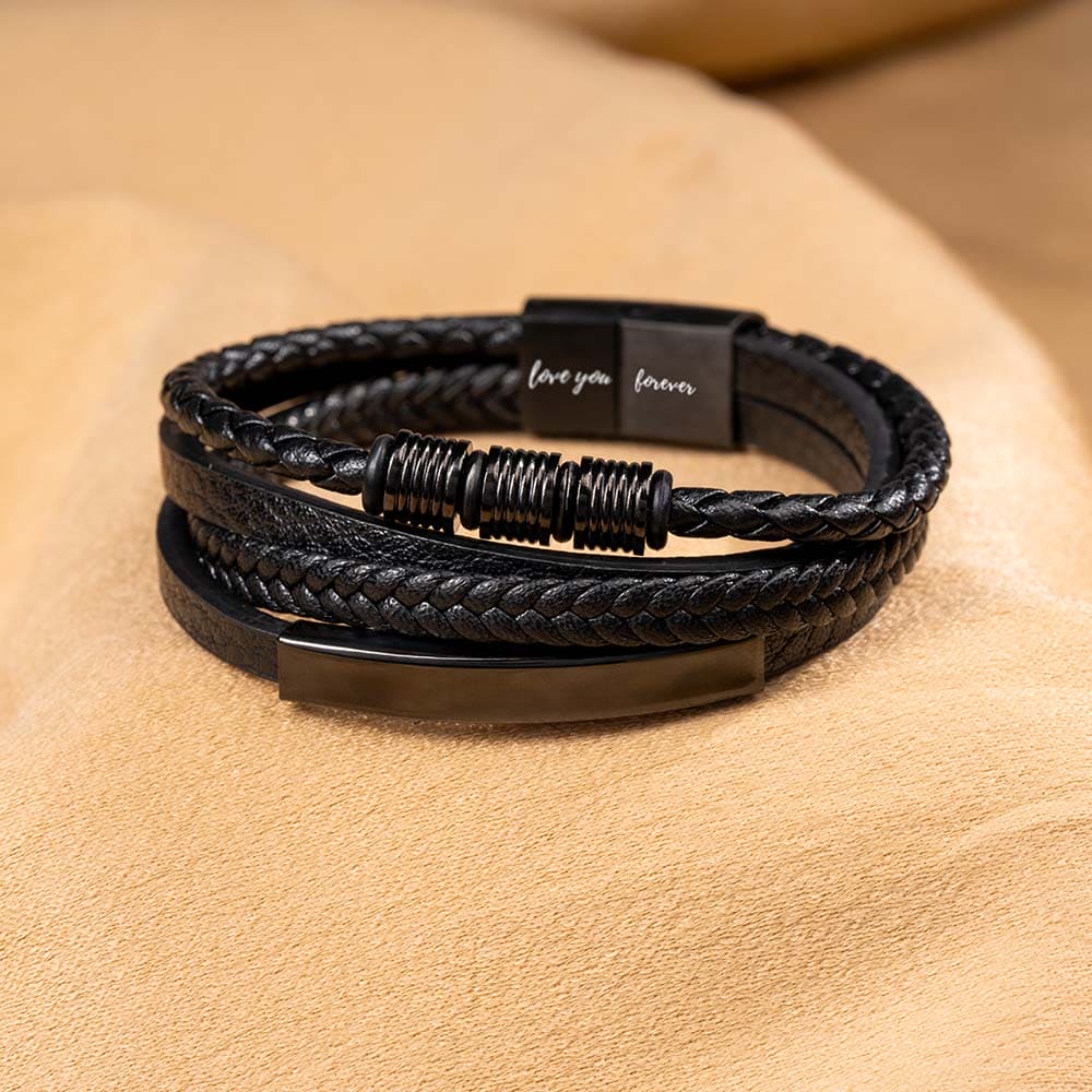 Celebrate an unbreakable bond with this sleek and meaningful men's bracelet. Made with high-quality braided leather and stainless steel accents, it’s engraved with “Love You Forever” as a constant reminder of your love and support. Perfect for any occasion—whether it’s his birthday, graduation, or just because.