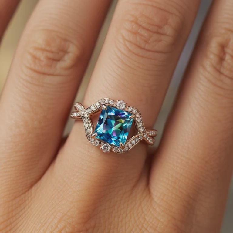- Unique Split Halo Design: The distinctive band and half halo accentuate the stunning blue princess cut moissanite.