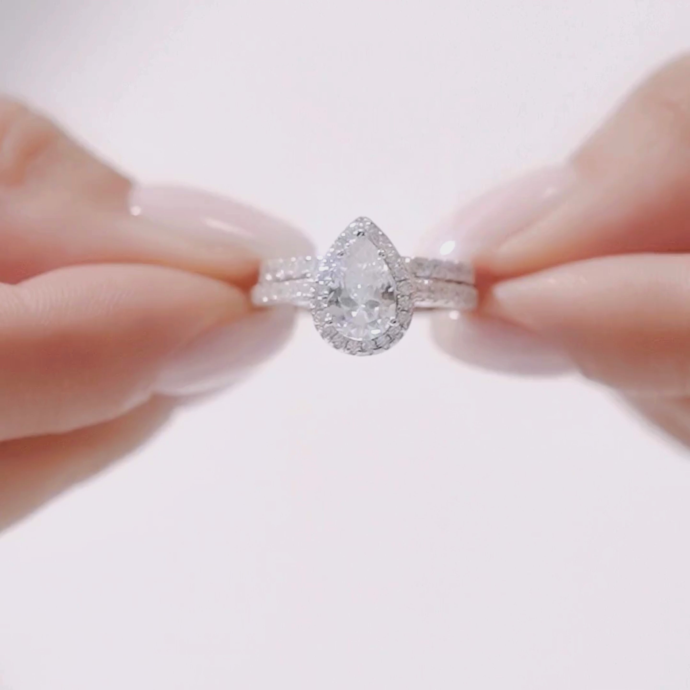 The Allure dazzles with its classic double band half-eternity halo design. Made from S925 sterling silver, it features a brilliantly beautiful pear-cut moissanite center stone and side stones also in moissanite. The light will bounce and sparkle from this ring from every angle.