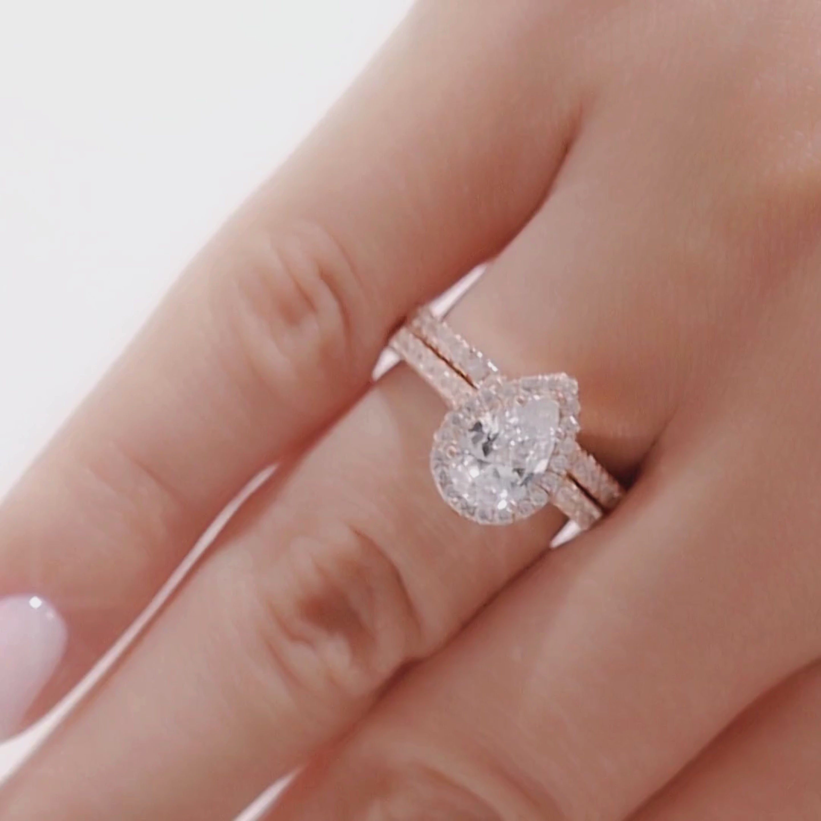 The Allure-Rose dazzles with its classic double band half-eternity halo design. Made from S925 sterling silver with 18K Rose Gold plating, it features a pear-cut center lab grown diamond and side stones in prong and channel settings. The light will bounce and sparkle from this ring from every angle.