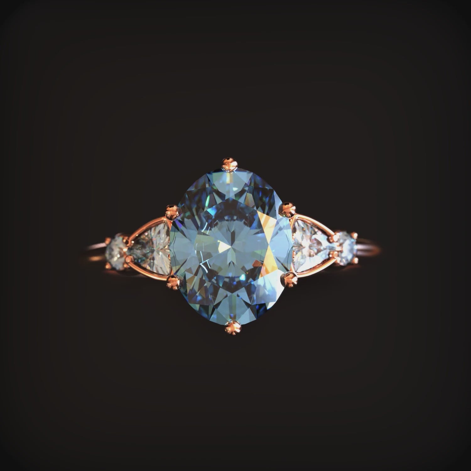 Set in 18K rose gold vermeil, this ring has a softness that balances its brilliance. The two side stones aren't just accents; they're integral to the design, creating a sense of flow and movement.