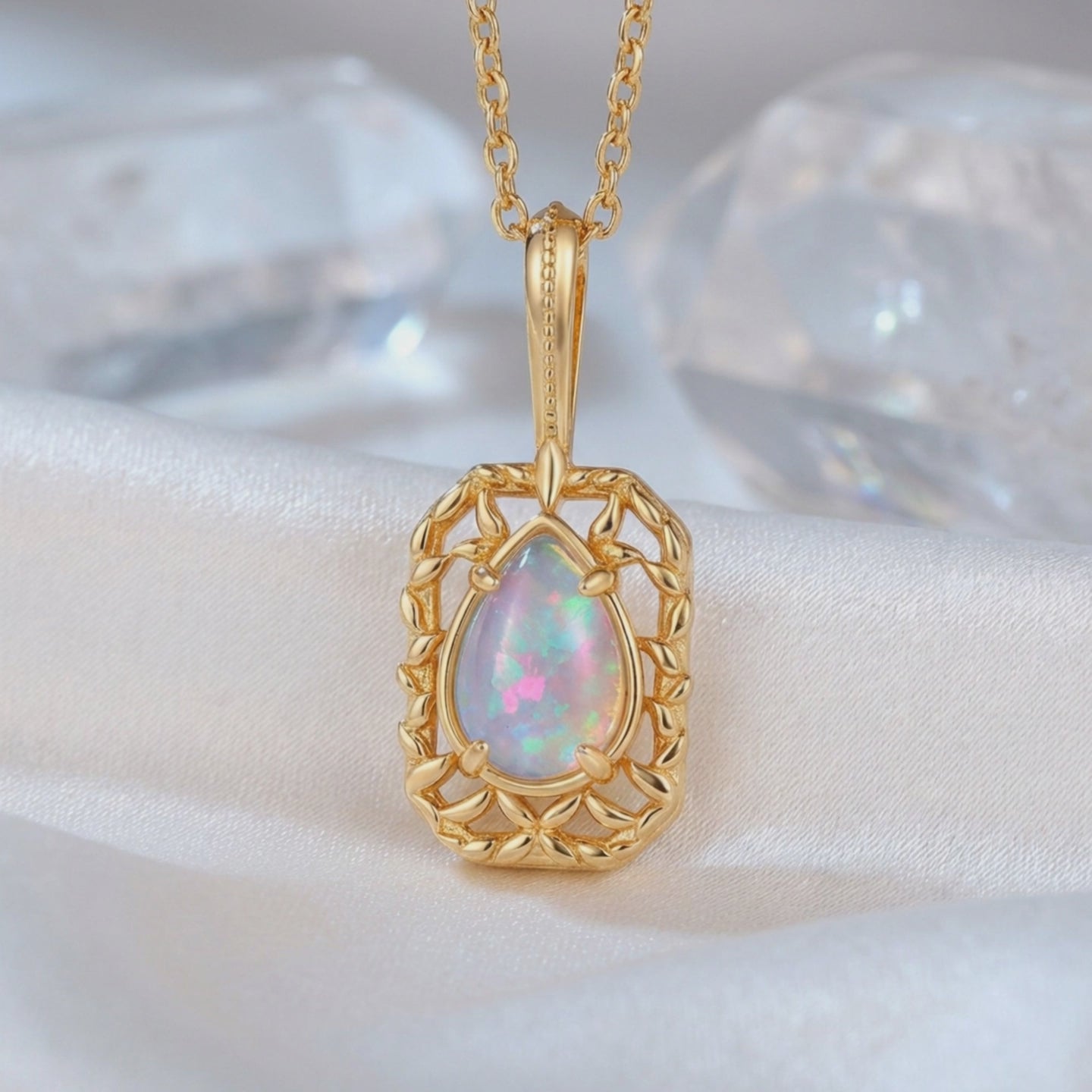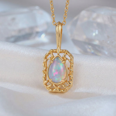 Watch the inner fire dance across your neckline. This natural opal pear pendant necklace is crafted in premium sterling silver with a rich gold-tone finish, offering a vintage-inspired aesthetic perfect for everyday elegance. Because every stone is earth-mined and formed over millions of years, the mesmerizing play-of-color you receive from the light diffracting through its microscopic silica spheres is a completely unique geological fingerprint.
