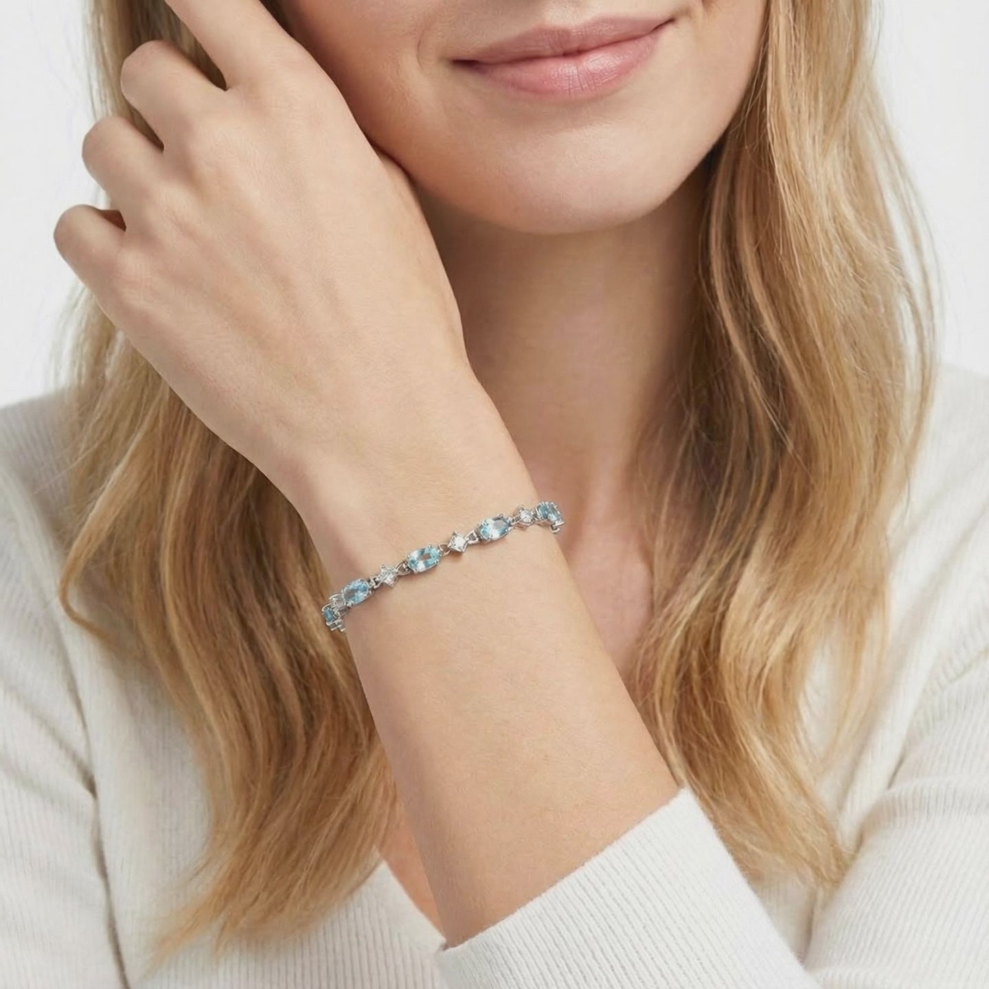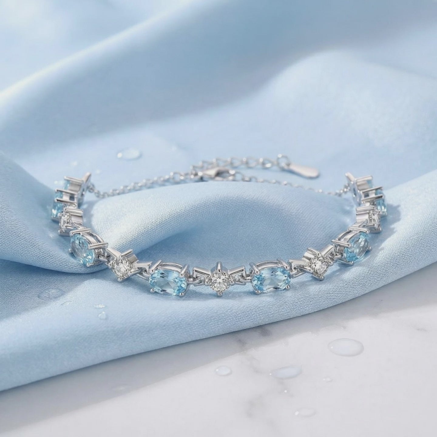 Mined aquamarine is often pale, inconsistent, or clouded by natural inclusions. This bracelet features Simulated Aquamarine, color-calibrated to the absolute ideal of light blue saturation. Each stone is precision-cut from A5 Grade material to ensure a high refractive index and maximum light return, outperforming the random quality of stones found in a mine.