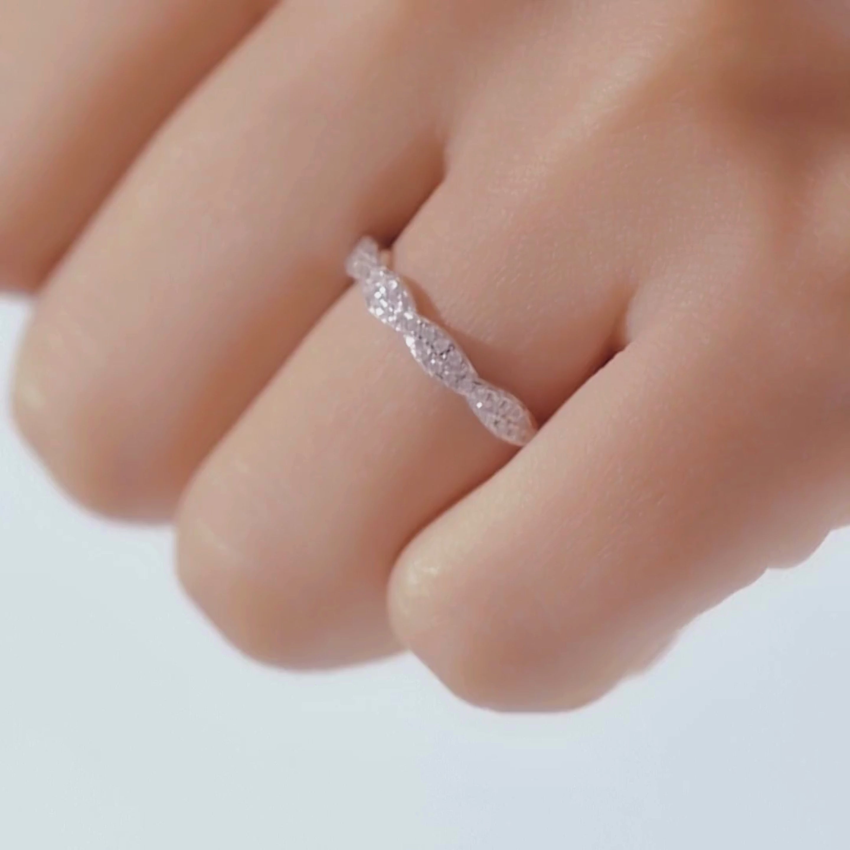 The Cressida showcases a unique design with its twisting double infinity pavé band. Made from S925 sterling silver, it features round-cut lab diamonds in channel settings.
