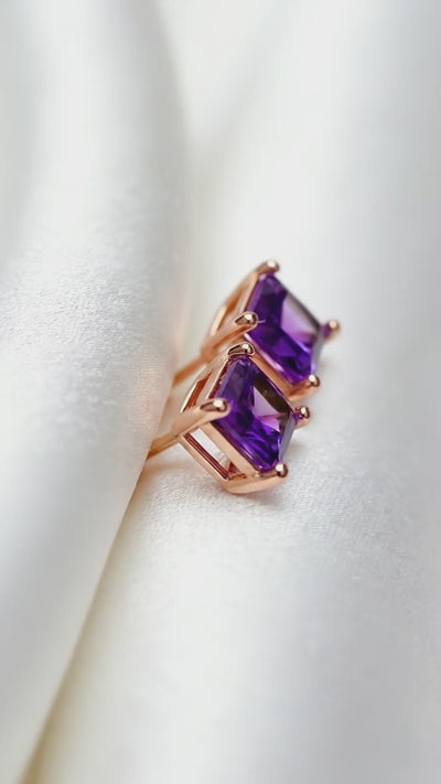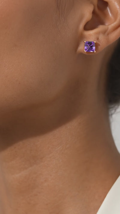 Mined amethyst is often found with uneven color zoning and internal fractures. These stud earrings feature Simulated Amethyst, color-calibrated to the ideal royal purple benchmark. Precision-cut from A5 Grade material for a high Refractive Index that outperforms standard crystals.