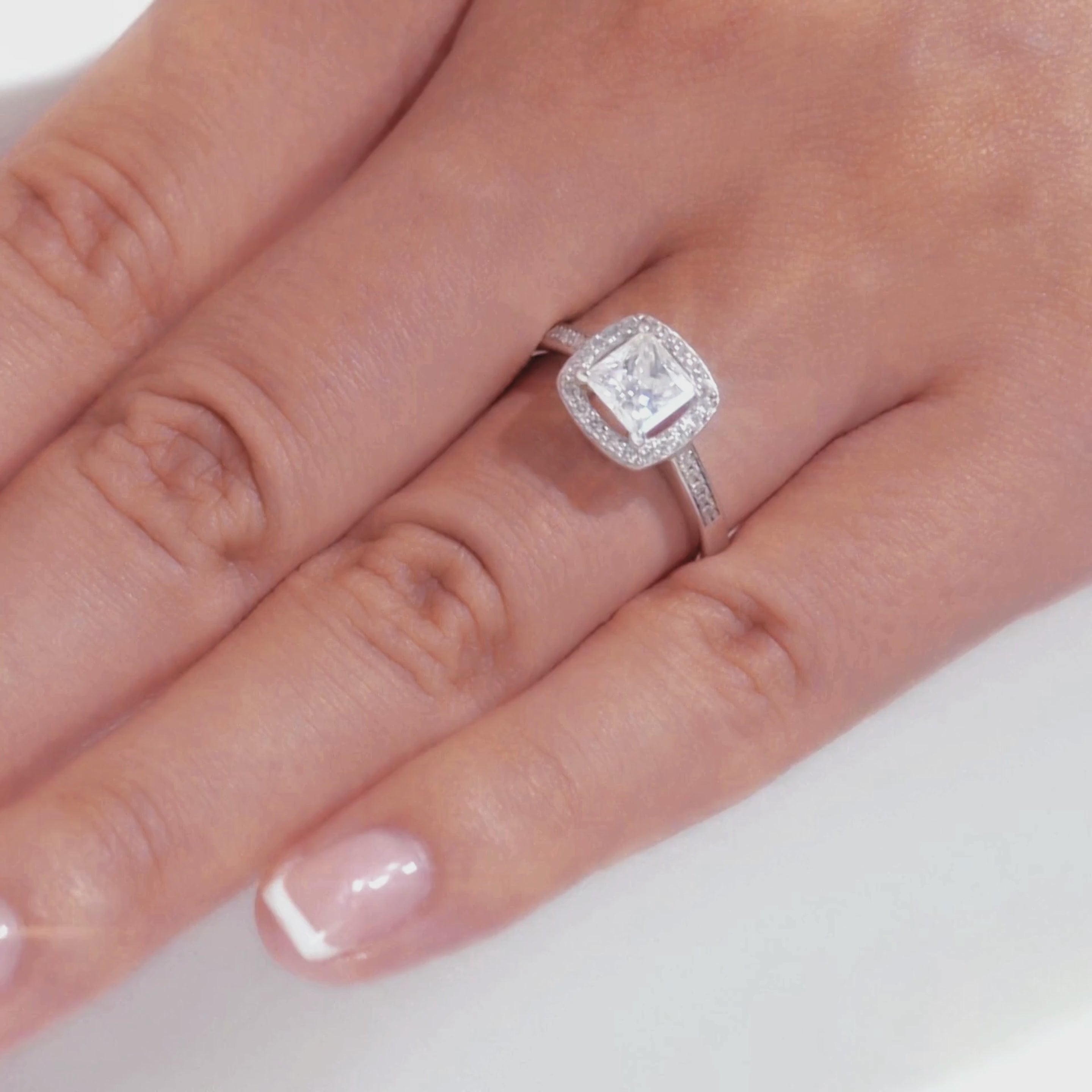 This stunning princess cut is set in a classic prong setting, surrounded by a delicate halo that amplifies its brilliance. Complemented by a sleek, half-eternity band, adding a touch of sophistication to this timeless piece.
