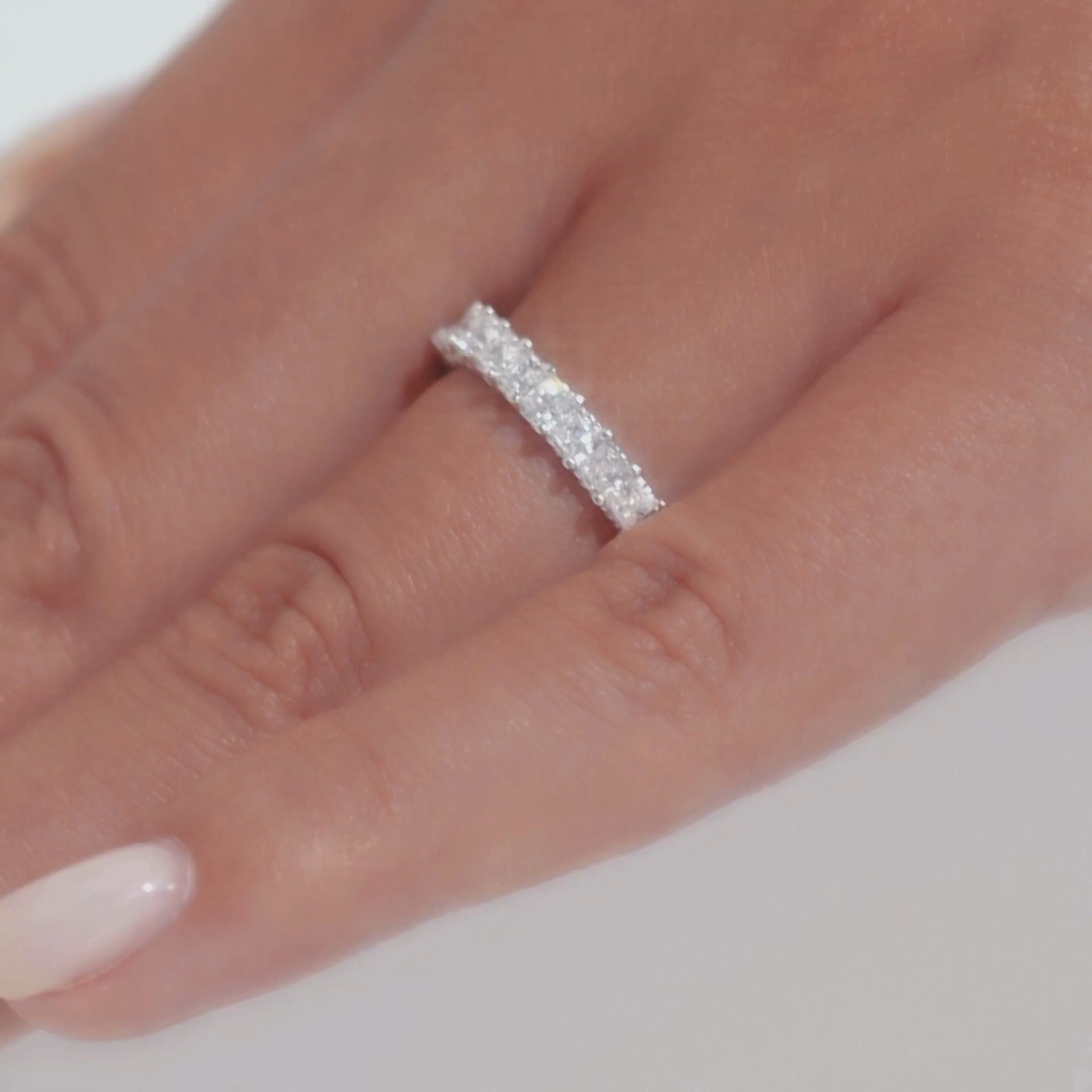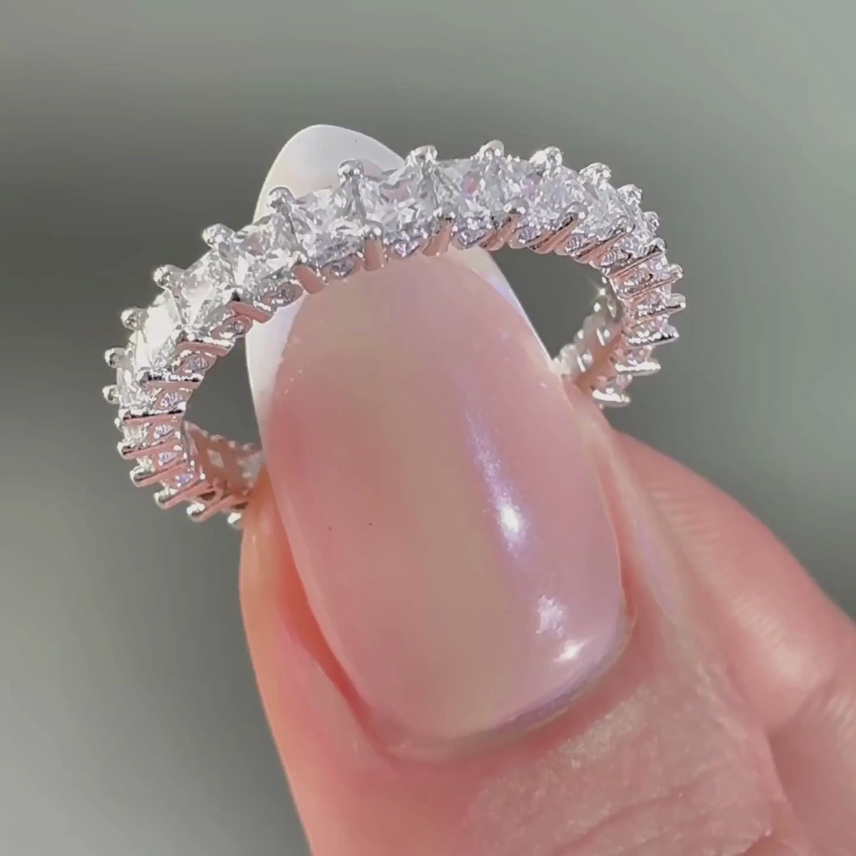 The Eternity epitomizes everlasting elegance. This full eternity ring, crafted from S925 sterling silver, features princess-cut simulated diamonds in a channel setting, offering a brilliant sparkle from every angle.