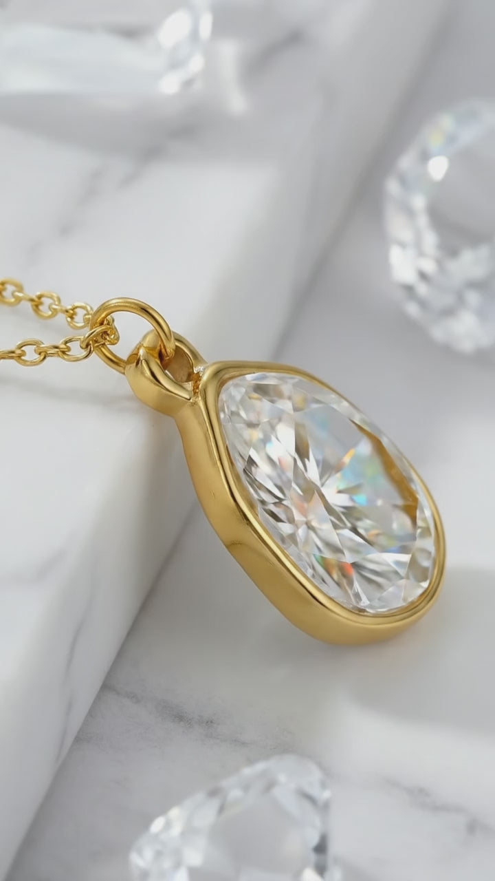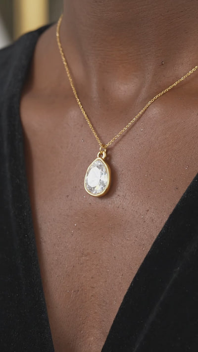 Mined diamonds are a marketing construct. This simulated April birthstone necklace delivers the optical brilliance you desire without the industry markups. Set in a protective bezel mount, the pear-cut stone is designed to withstand the grind of daily wear.