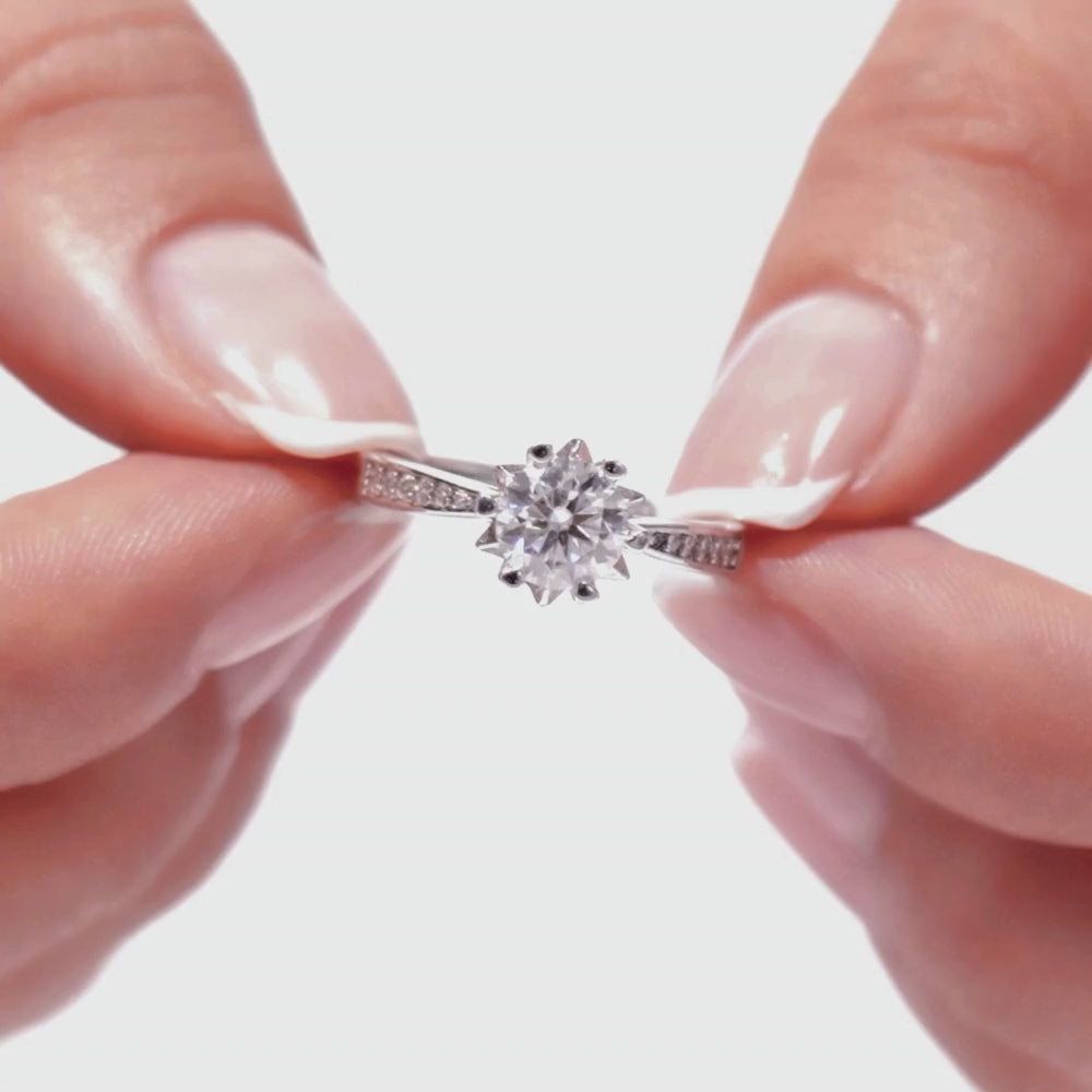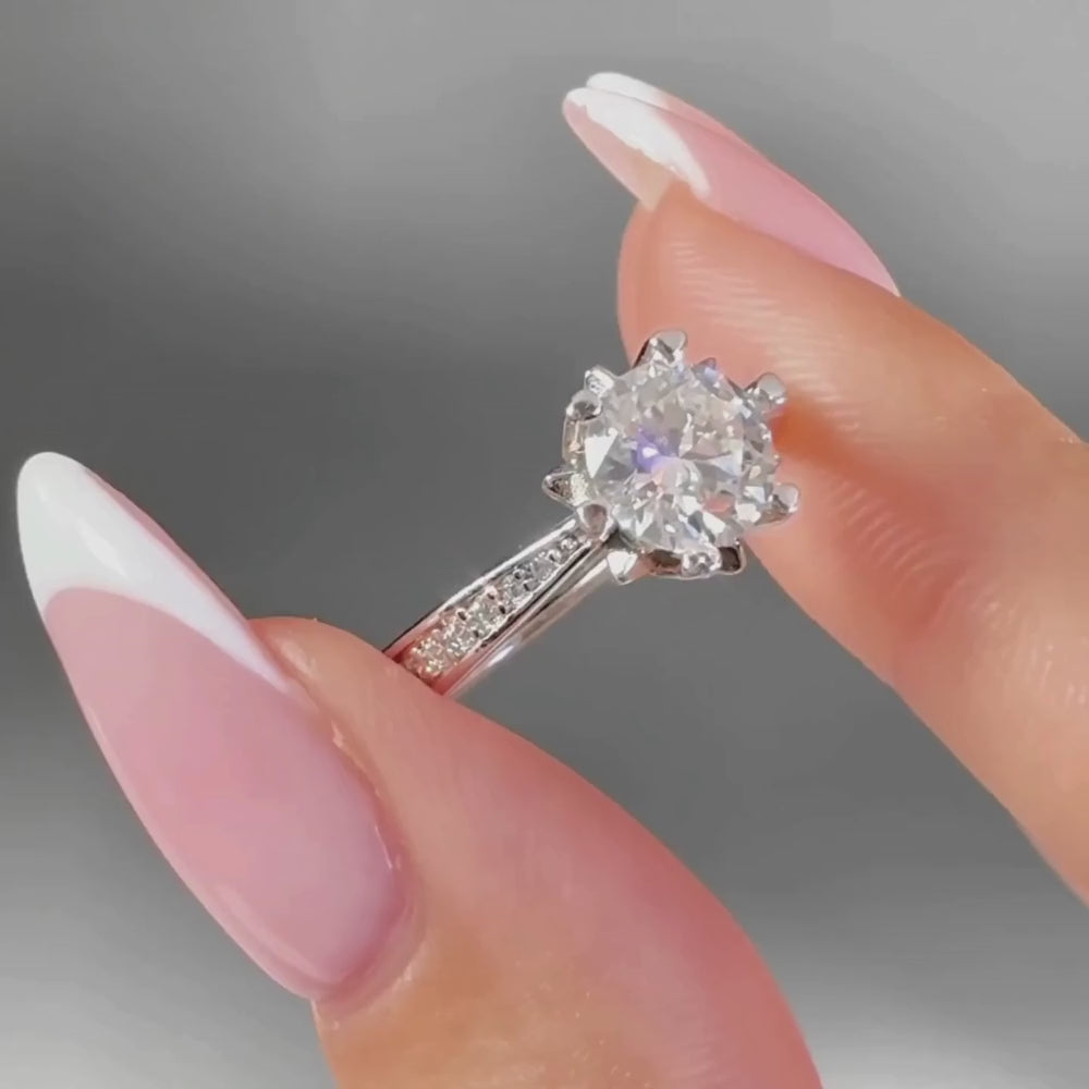 Experience the timeless elegance of The Lumina, a ring that embodies classic sophistication and modern simplicity. The round-cut Moissanite gemstone, set in a prong setting, showcases its brilliance and fire. Complementing the stone is a sleek, half-eternity band crafted from premium S925 sterling silver.