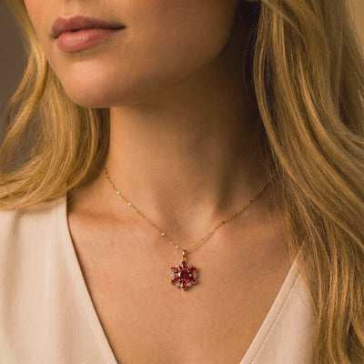 July birthstone simulated ruby blossom necklace in gold-finished stainless steel worn by a model.