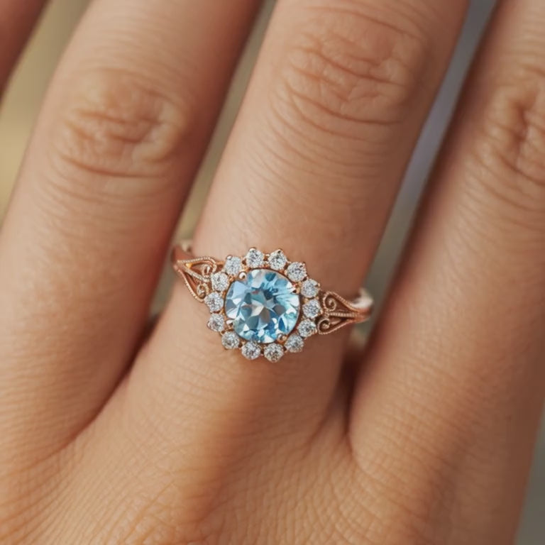 The Marinella features a brilliant 3 carat Round cut blue moissanite center stone, framed by a delicate halo of shimmering accent stones that enhance its vibrant hue. The vintage-inspired design, coupled with the warm glow of 18K Rose Gold Vermeil, creates a harmonious and sophisticated aesthetic. Side stones on the band further elevate its sparkle, making it a true statement of refined taste.