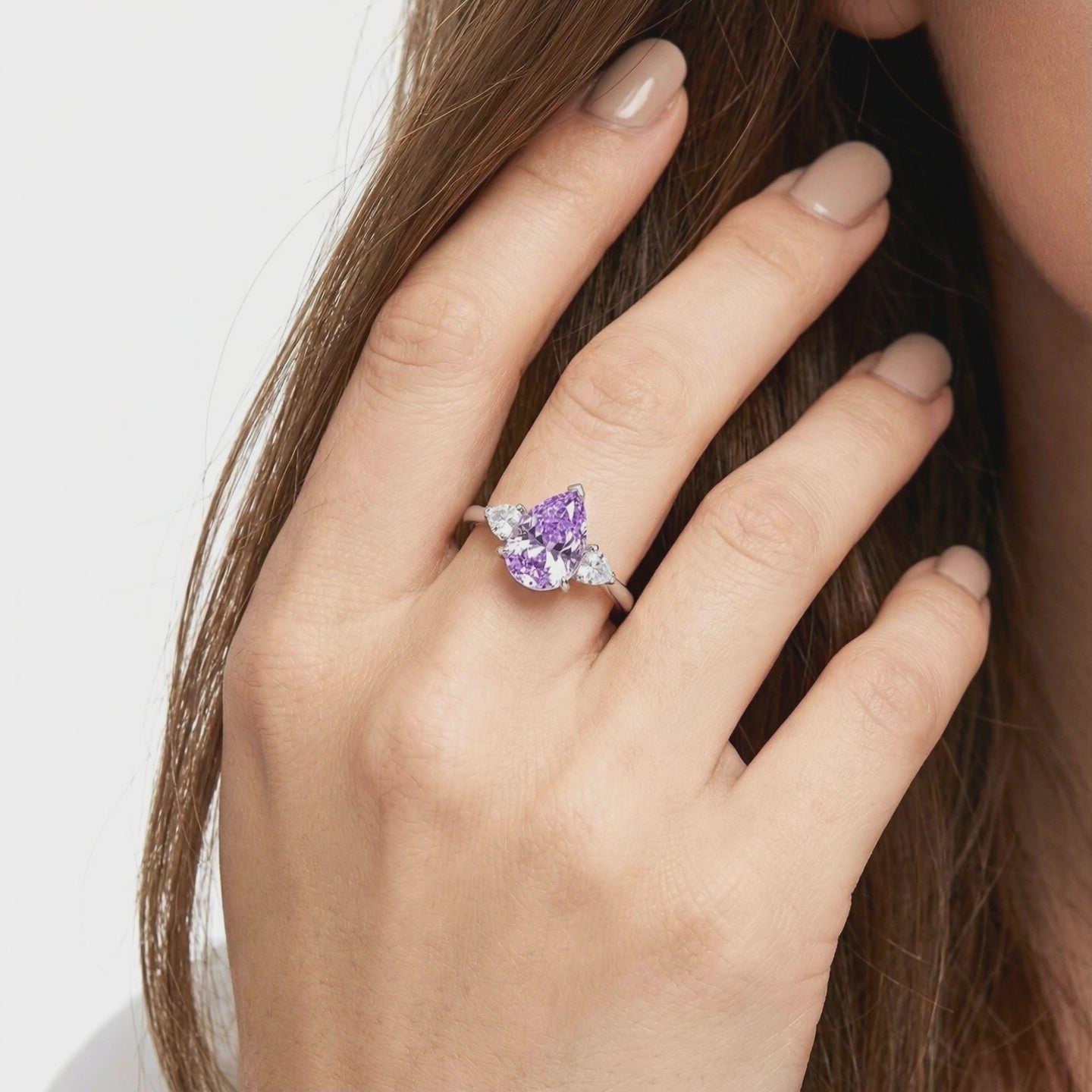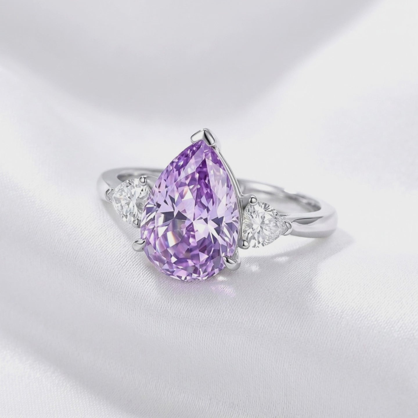 Pear-cut royal purple simulated amethyst ring in sterling silver on white silk, angled view.