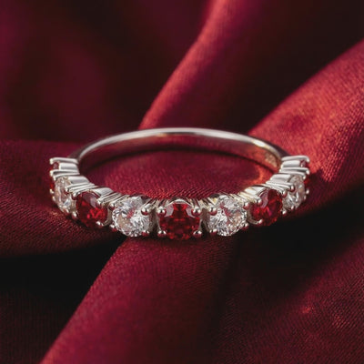 Mined rubies are often inconsistent, cloudy, and dull. This is Simulated Ruby, engineered to match the museum-grade "Pigeon Blood" red benchmark. Every stone is precision-cut from A5 Grade material to ensure maximum light return and flawless color saturation across the entire band.