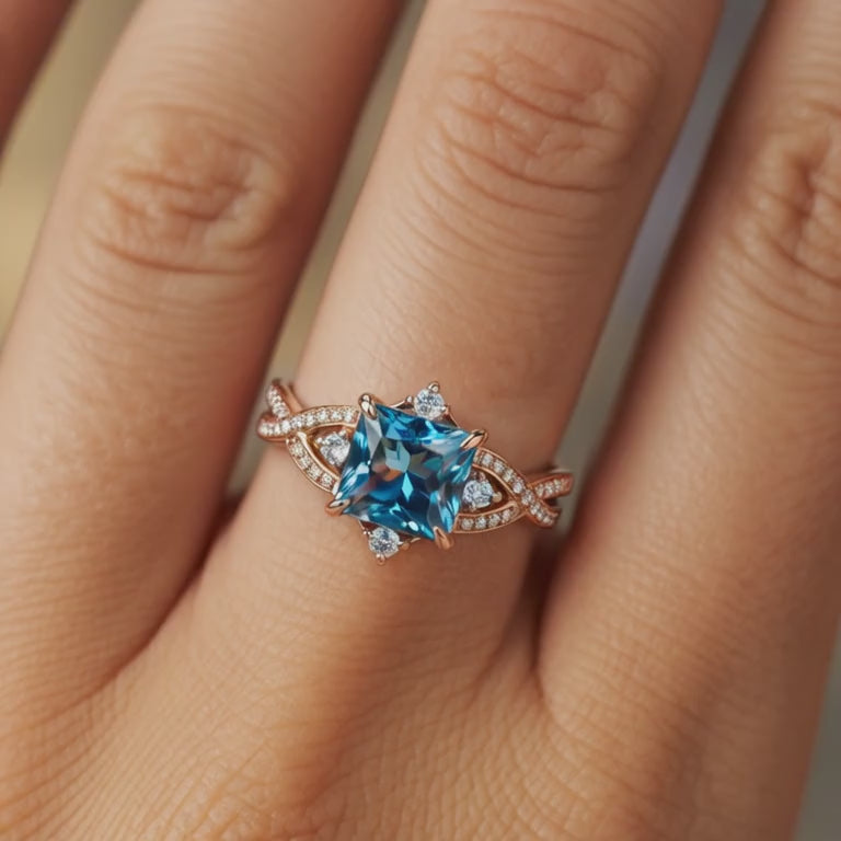 The Sapphire Vista is a breathtaking ring featuring a vibrant 3CT princess cut blue moissanite, surrounded by an intricate, vintage-inspired design.