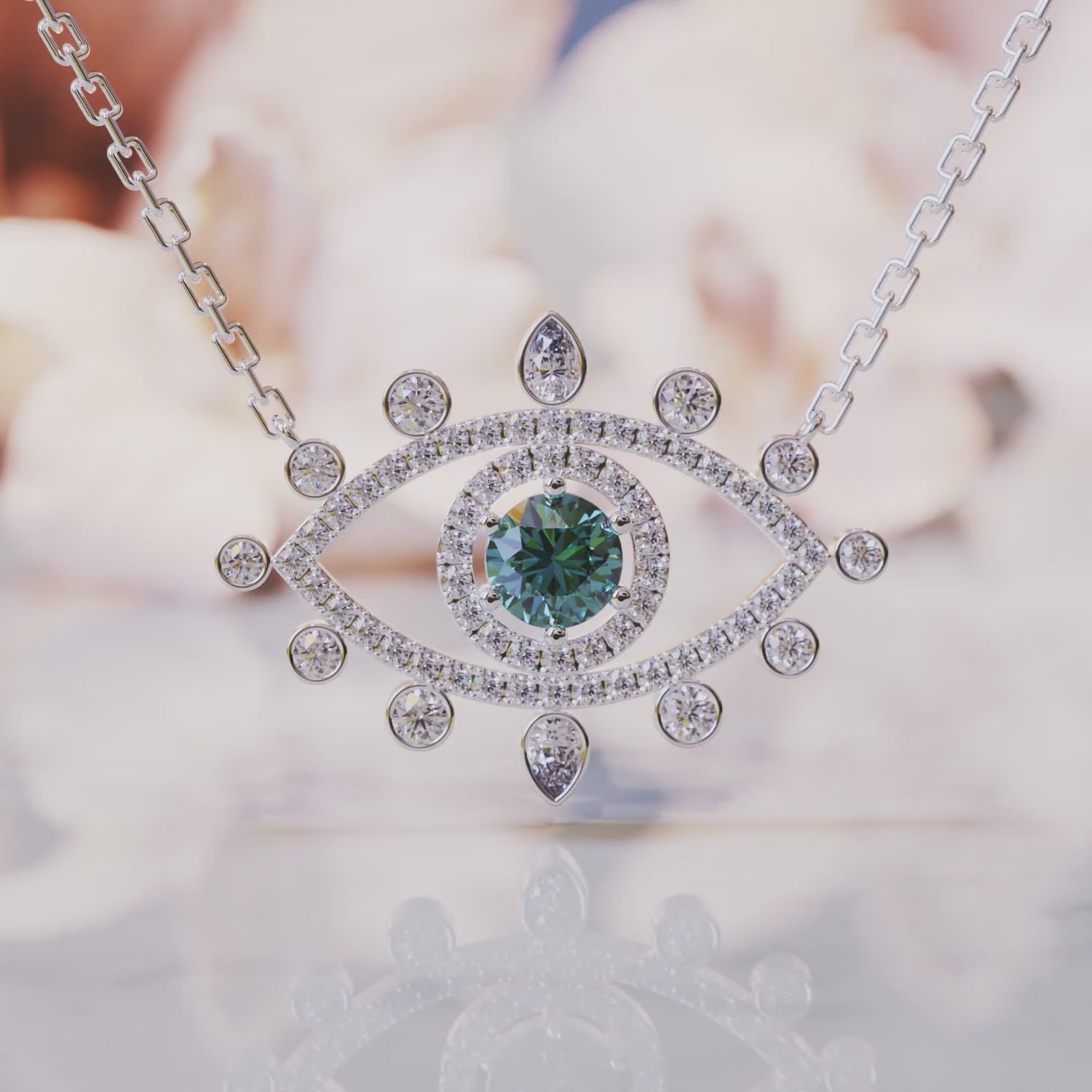 The Teresa Alexandrite Necklace features a stunning 0.8CT round-cut lab-grown Alexandrite, known for its captivating color-changing properties. This high-quality, internally flawless gemstone is surrounded by a unique evil eye design, accentuated with flawless lab-grown diamond simulants for a shimmering halo effect.