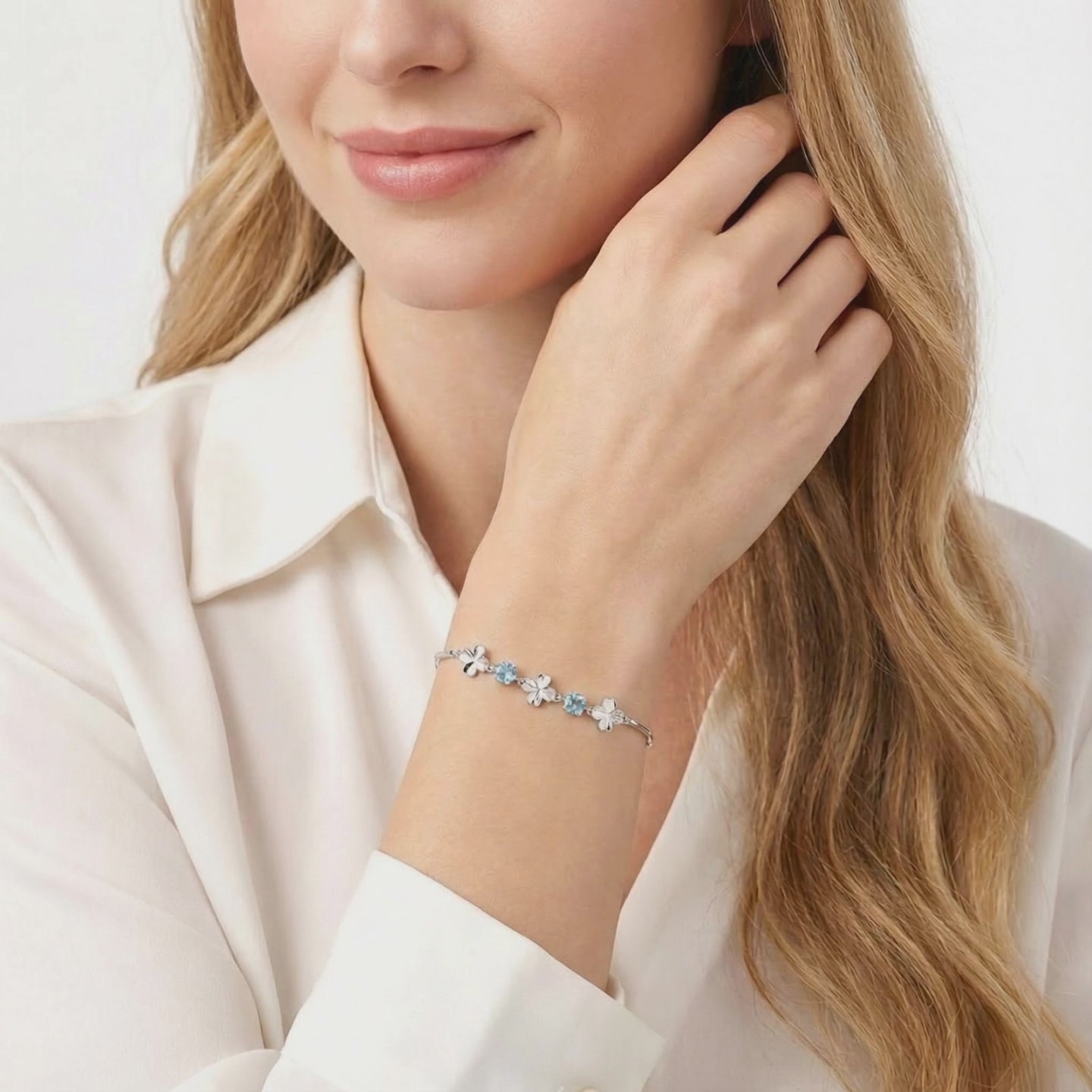 March birthstone station bracelet in S925 sterling silver with round light blue stones on blue silk.
